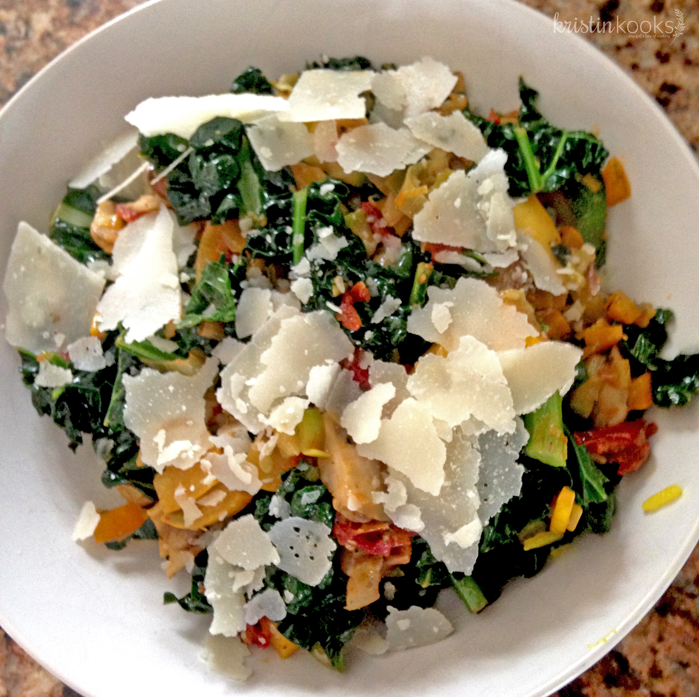 Veggie bowls. My favorite go-to quick and easy lunch, dinner or heck, even breakfast depending on what you put in it. Veggie bowls are such a representation of the way I cook. Open the fridge, zero in on one ingredient (say meaty mushrooms or fresh asparagus for example) and then rustle up some add-on items that will give me that taste sensation I’m craving. This weekend I wanted something with an italian flair. So for me the first ingredient I zeroed in on upon opening the fridge, was a fresh bag of kale. Hmmm…what next? Further investigation led me to the following ingredients, all of which worked perfectly in my mouthwatering veggie bowl – leeks, green zucchini, yellow squash, an orange bell pepper, zesty sundried tomatoes packed in oil (Trader Joe’s makes my favorite), portabello mushrooms and finely shaved parmesan romano cheese. Yum. Super satisfying, super healthy and super tasty. I mean, just look at that goodness!