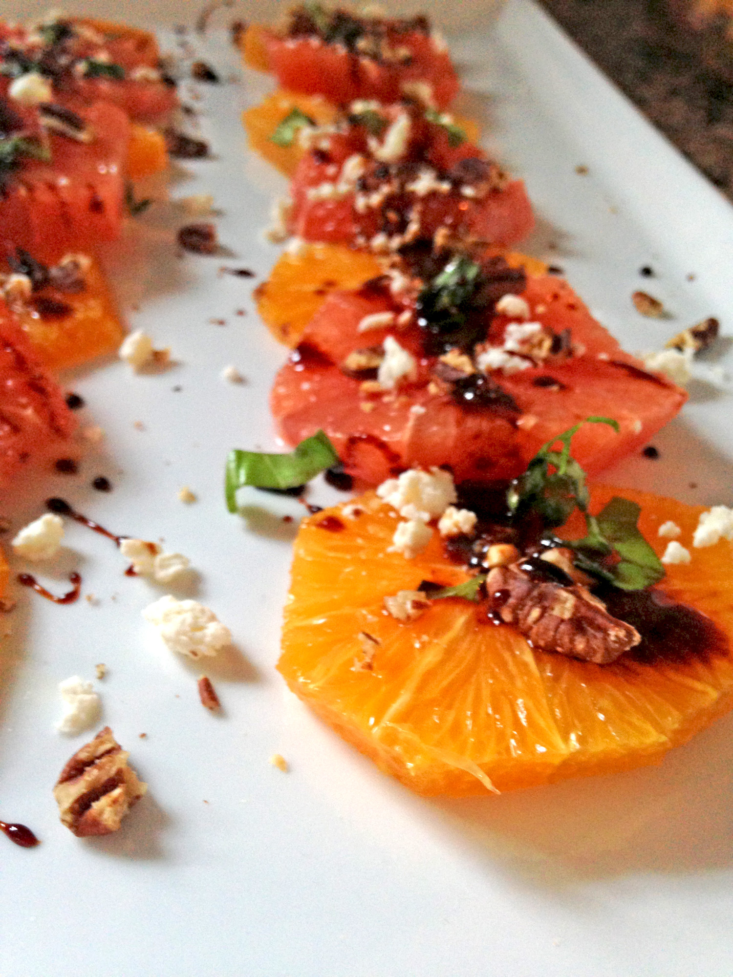 To assemble, arrange alternating grapefruit and orange slices on your serving platter, top with crumbled feta, pecans and thinly sliced basil slivers. The recipe says you can top the citrus with the remaining brown sugar but I usually skip this step, especially if the citrus are in season and super sweet. Drizzle the balsamic dressing over everything just before serving and enjoy!