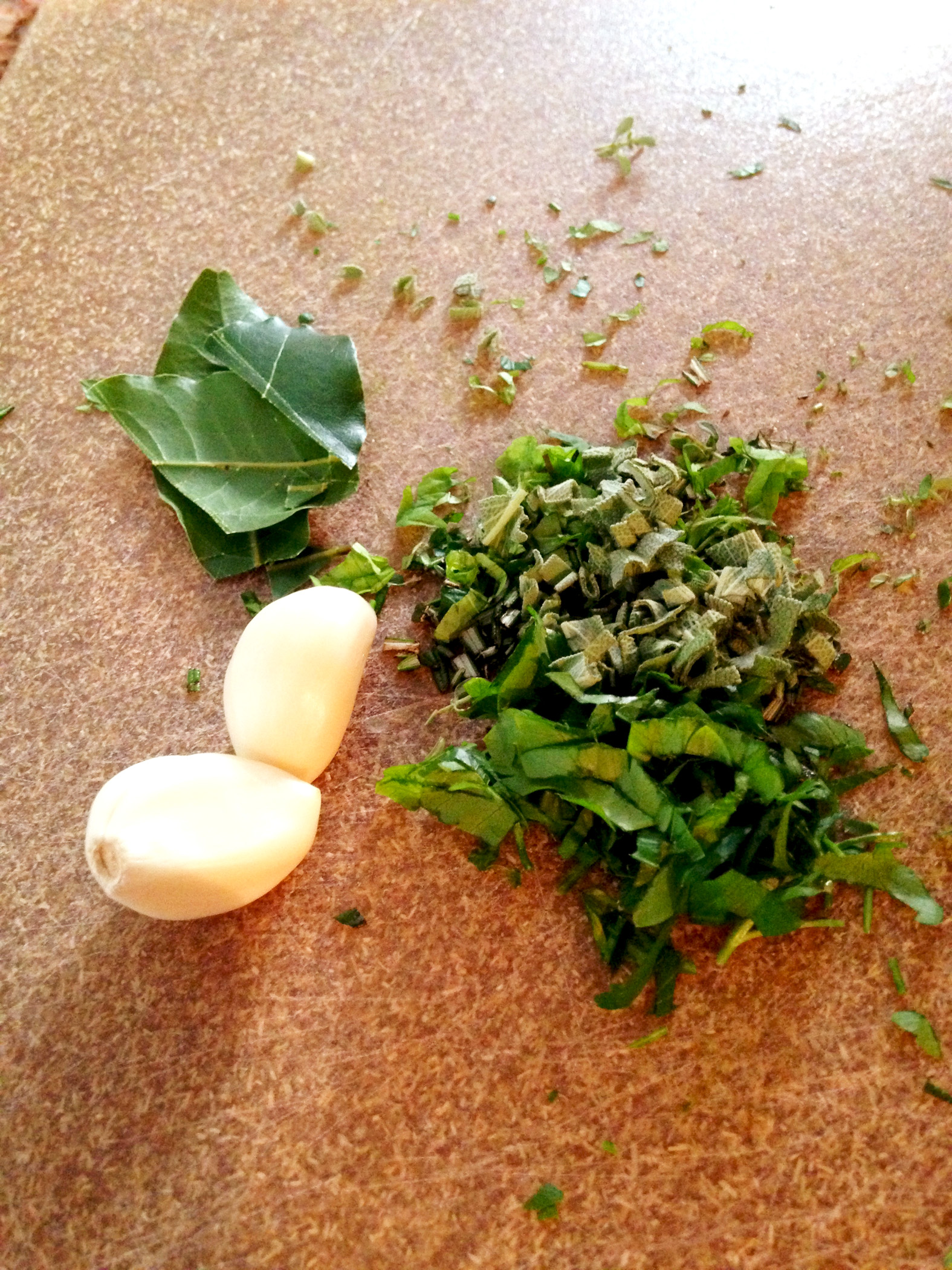 I told you it was a lot of herbs! OK, let’s get to it. Speaking of herbs, time to chop. I simply chop up all the herbs in the ingredient list and keep them on my cutting board. You will want to put a little over half of your parsley in its own special pile as that is used to season the inside of the chicken as well.