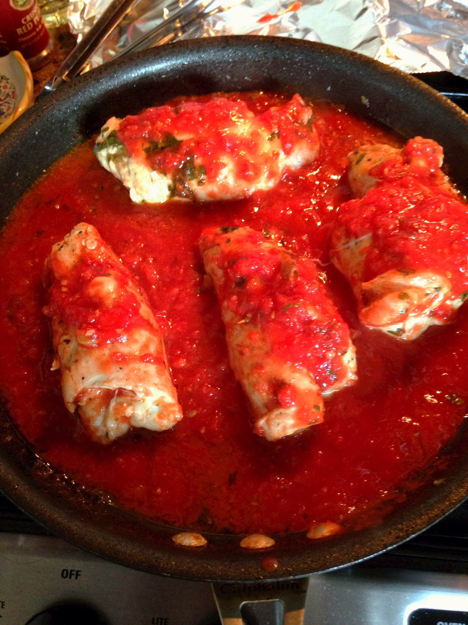 Once chopped, set aside. On to the chicken. Take your mallet or back of a heavy spoon (my method) to your chicken. I place each chicken breast in a freezer bag and just pound it to my required thinness. That way, no mess and I can just throw away the bag! For this recipe, try for 1/4″- 1/2″ thickness. Once your chicken is ready, place the breasts on a plate and season the inside of each one with salt and pepper. Next divide up the garlic, pecorino, parmesan and mozzarella and use to cover each slice. This picture doesn’t include my mozzarella cheese, but trust me, it was added right after this picture!