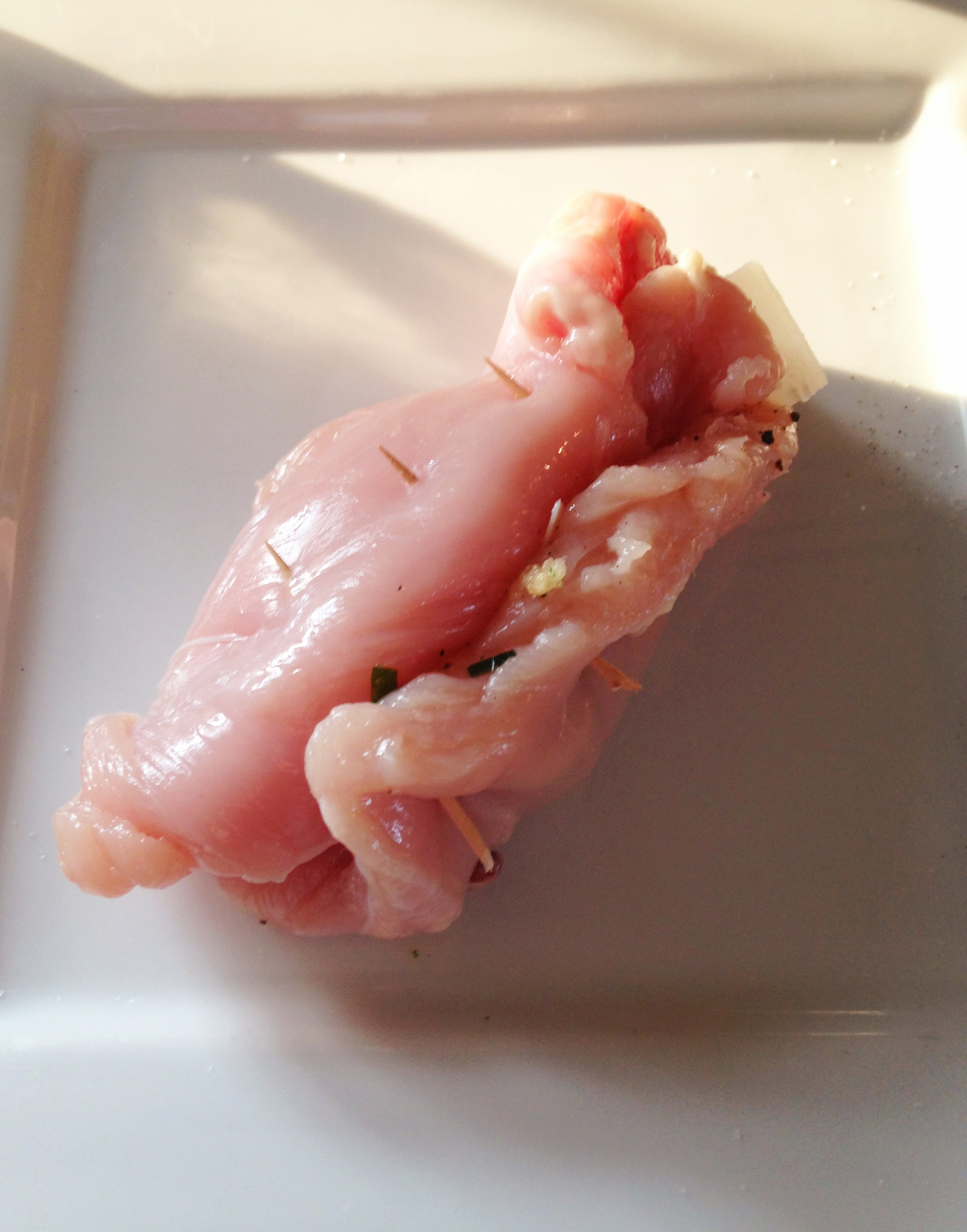 Once your chicken slices are covered with all the cheeses and spices, roll up into roulades, starting from one edge to the other. Secure with toothpicks, like so: