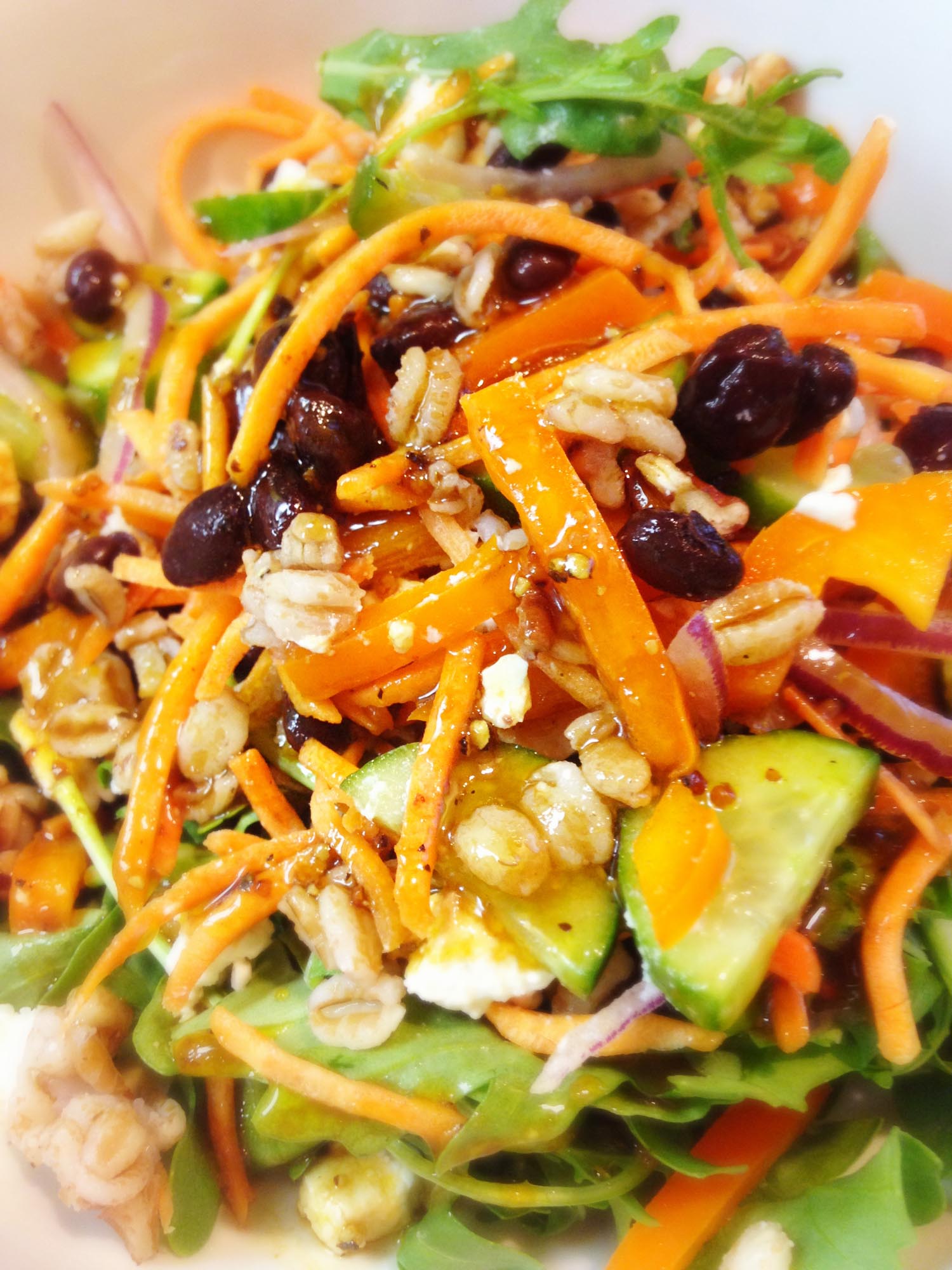 Third Layer: leftover farro cooked with almonds and golden raisins, feta cheese, black beans