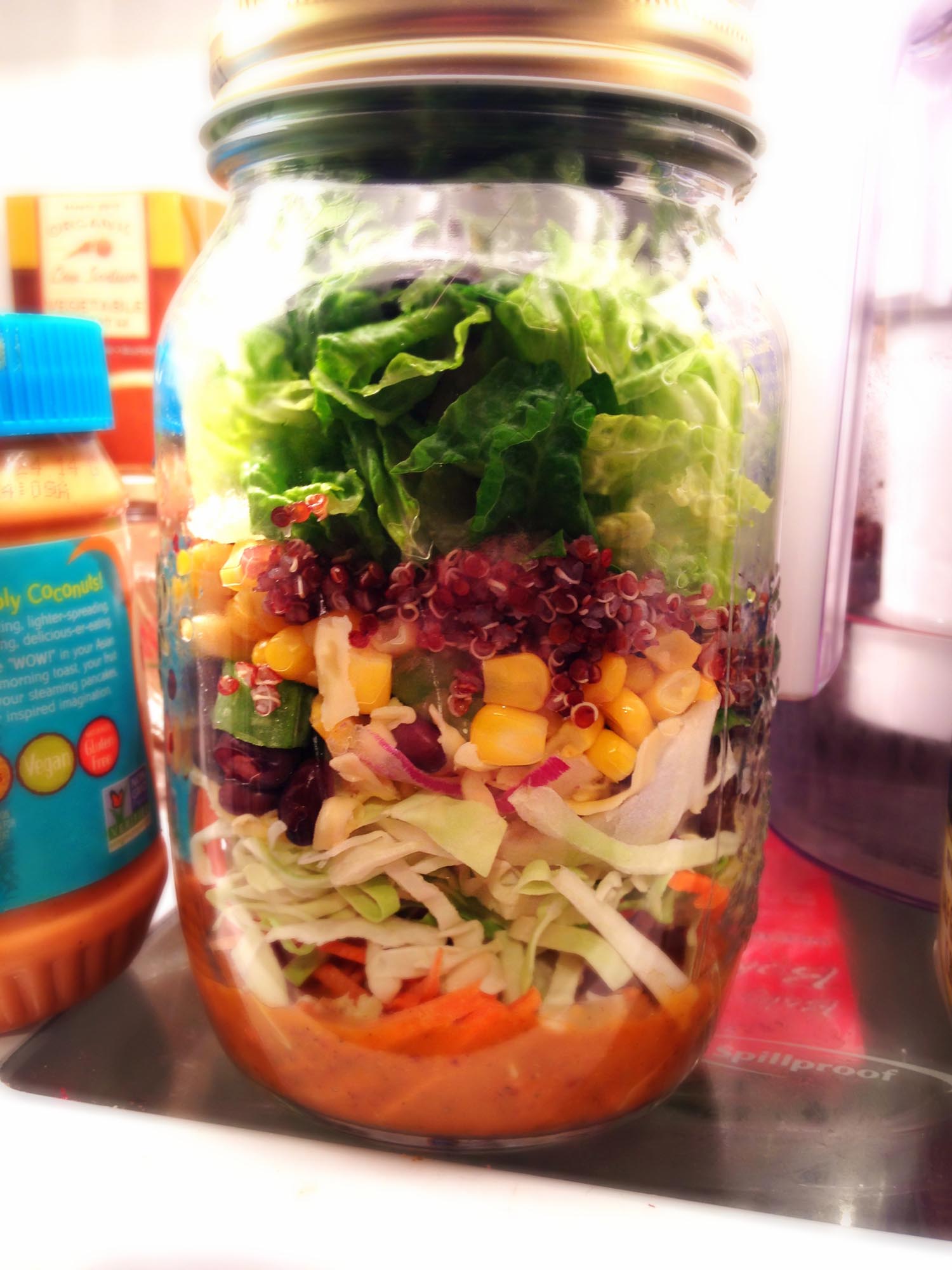 – Bottom Layer: if going with a dressing, this is the first thing that should go in the jar whether you choose something creamy or a vinaigrette. The key with salad jars is to make sure they STAY upright. If so, the bottom layer will give you no issue whatsoever. If the jar does tip over your dressing may soak into some of your greens making them wilt after all day in the fridge. Not ideal.