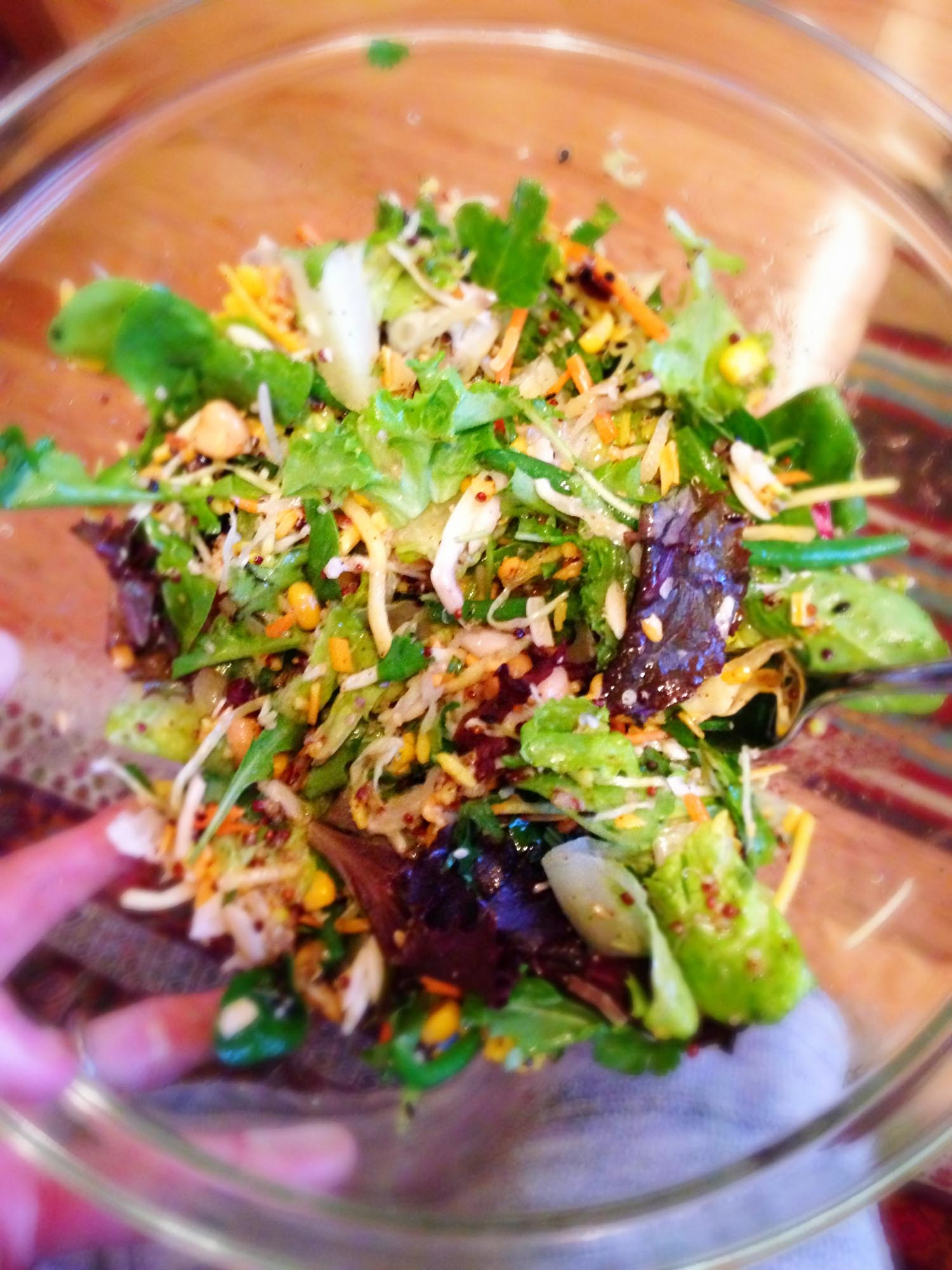 • Sliced red onions, carrots, cucumber, red cabbage, quinoa, black beans, corn, leftover taco meat, light cheddar cheese, avocado, crunchy romaine (homemade mexican vinaigrette)
