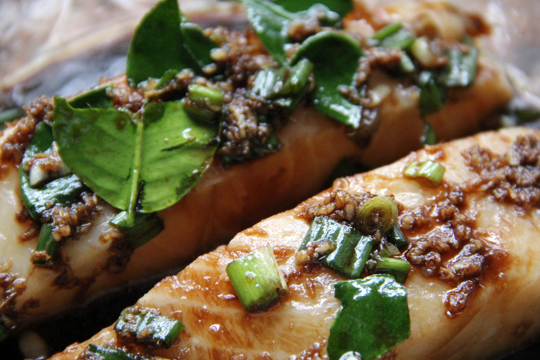 Kaffir lime leaves are often used in Thai cooking and provide a wonderfully fragrant bite. The taste is so amazingly fresh and delicious. I often find them in the fresh herb section of my grocery store. This marinade is a good starting point for any asian style marinade. I’ve made it countless times with variation depending on what I have in my fridge and pantry. Sometimes it incorporates fresh lime juice, honey, red pepper flakes or even lemongrass paste. It changes every time. As I mentioned, I had two beautiful sea bass filets ready and waiting for something liven them up. Mixed with garlic, ginger, sesame oil and the other ingredients listed below, it’s all a match made in heaven.