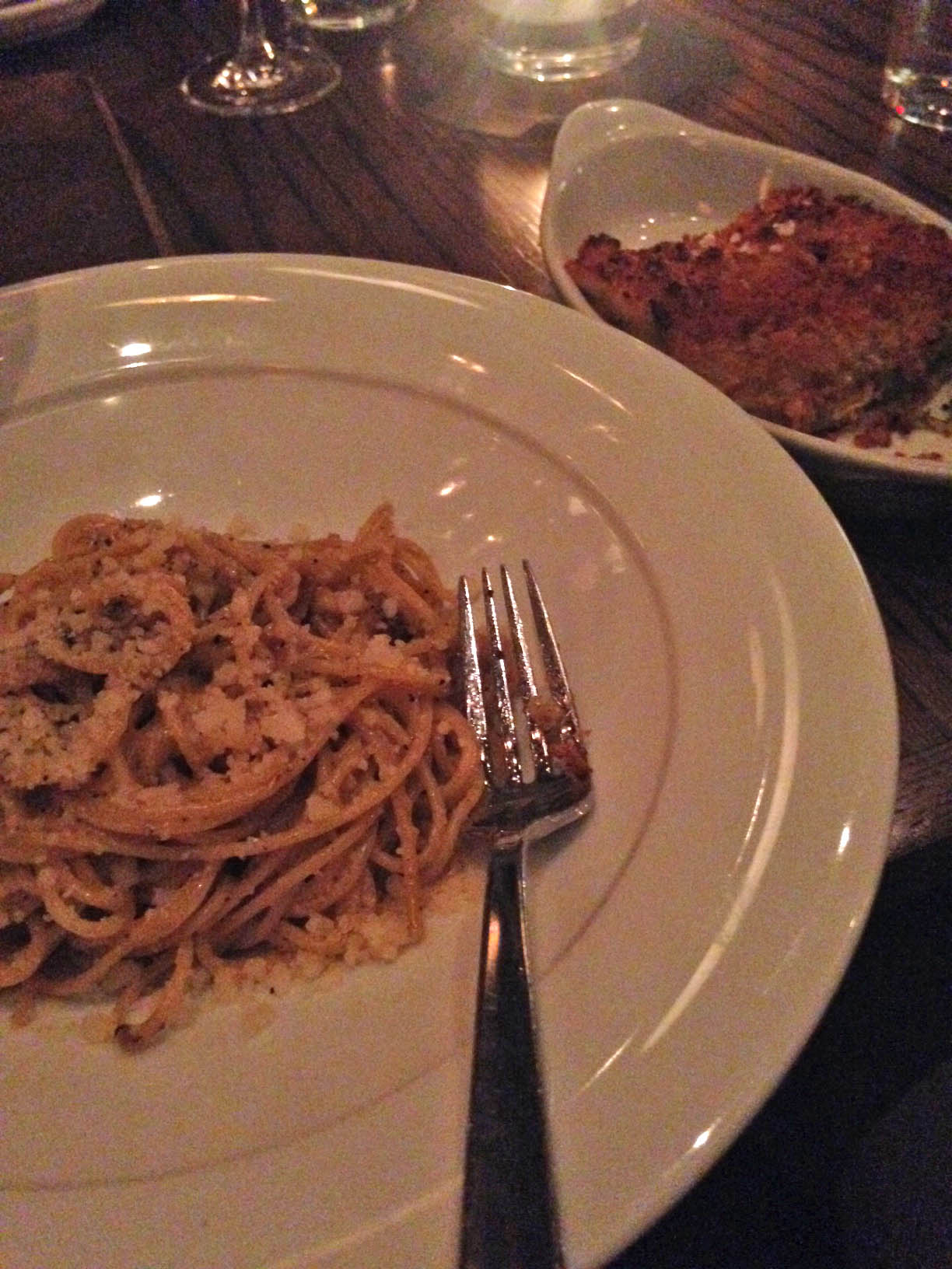 My sister and I split our meal and started with the watermelon and tomato salad with almonds, shishito pepper and sherry and the spicy roasted eggplant with peanut, chili d’arbol, tomato and chicken stock. Both were spectacular.